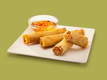 Shredded pork, grilled pork, and spring rolls on rice vermicelli.